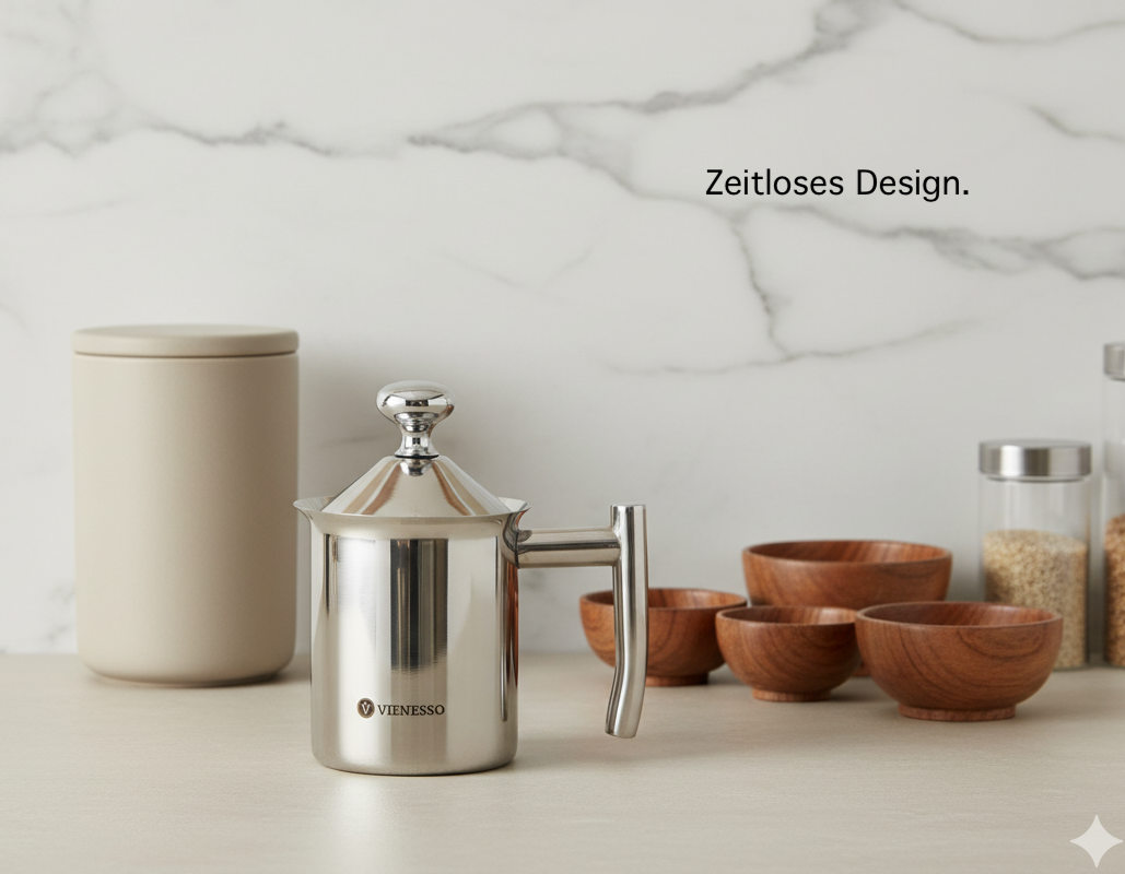Der Manuelle Milchschäumer ist gefertigt aus reinstem Edelstahl mit poliertem kratzfestem Hochglanz-Finish im edlen Vienesso Design. Rostfreies Material, langlebig und ergonomischer hitzebeständiger Handgriff mit spritzdichten Deckel.