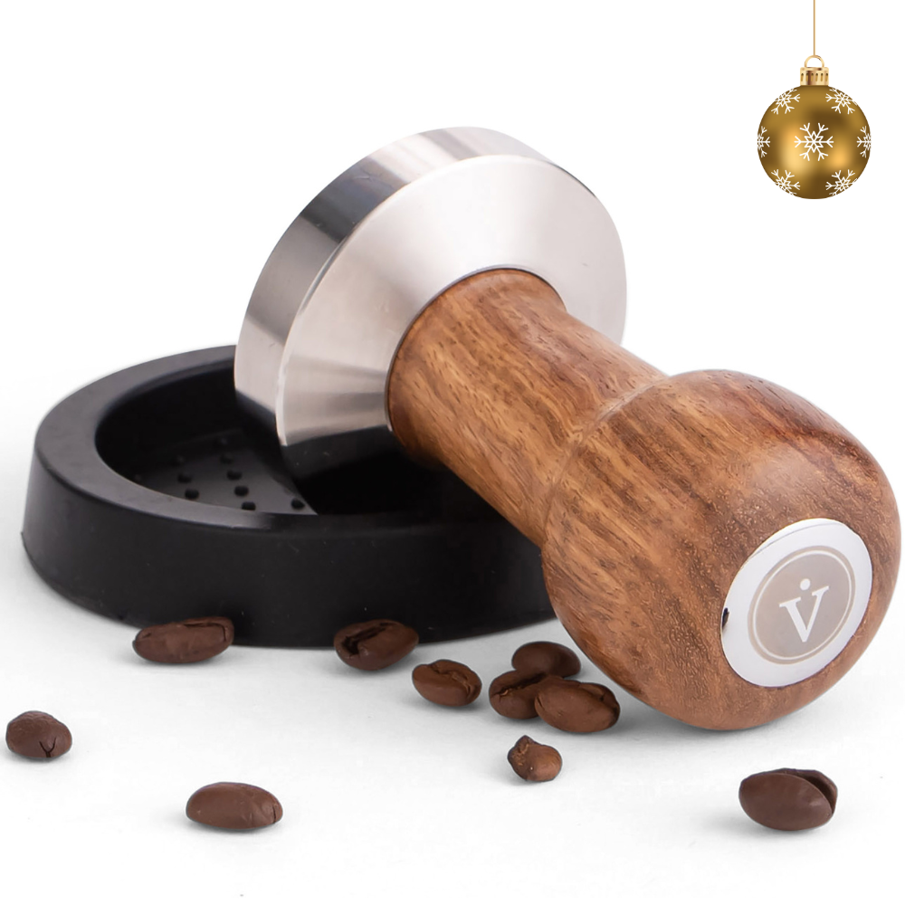 Edler Handgriff: Mit dem Echtholzgriff aus Rosenholz und dem abnehmbaren Tamper-Fuß aus Edelstahl liegt der Kaffee-Stempel besonders leicht in deiner Hand.